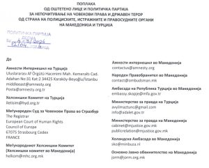 Од оштетено лице и политичка партија за непочитување на човекови права и државен терор од страна на полициските, истражните и правосудните органи на Македонија и Турција. Линк до документот: https://drive.google.com/file/d/18rSjcyZg9LHzrk7YSC0l2pPYlIqoKXun/view